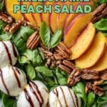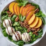 A refreshing and vibrant Millionaire Peach Salad featuring ripe peaches, fresh mozzarella, peppery arugula, toasted walnuts, tangy feta, and aromatic basil, all drizzled with a sweet balsamic glaze. Perfect as a light lunch or elegant appetizer.
